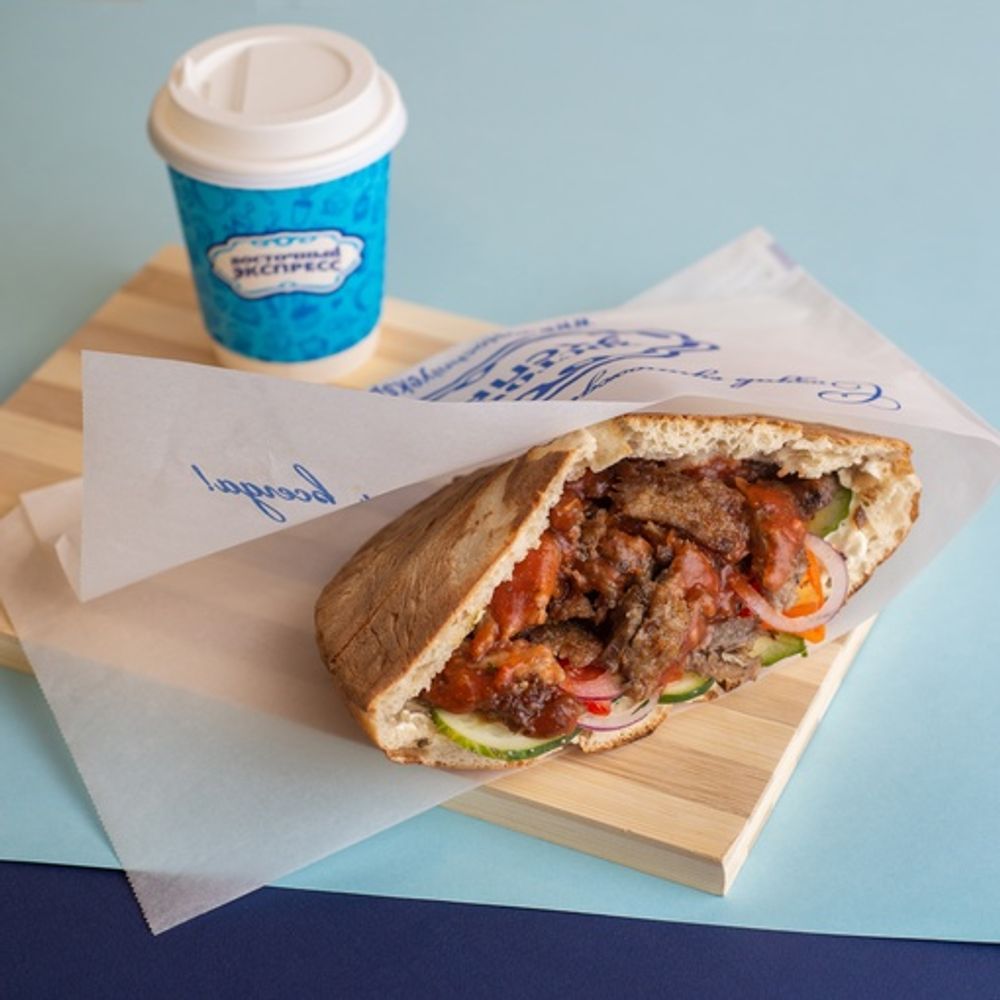 Говядина приготовленная на мангале в лепёшке из печи со свежими помидорами, солёными огурцами и фирменным соусом